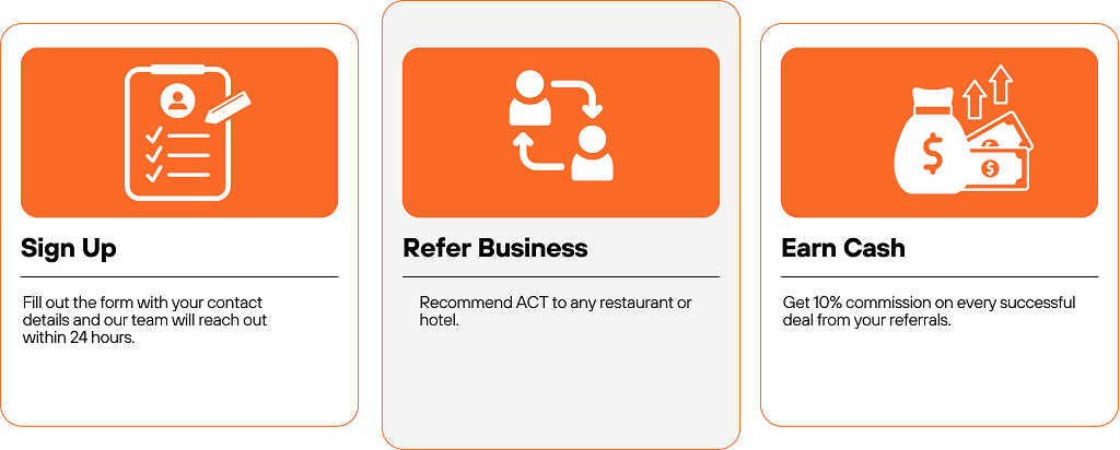 Earn cash with our referral program! Be Part of ACT’s Referral Program! Help Resturant and hotel owners discover ACT’s fully integrated resturant managemnet system powered by Oracle , and earn commision on every successful deal closed! The Registration form First name* Last name* Email* Mobile phone* Your title*Referral’s customer information: Referral’s first name* Referral’s Last name* Referral’s email Referral’s mobile phone* Type of Business?*CaféHotelRestaurant What system does the customer need?Simphony POS for RestaurantInventory ManagementSelf-Order KioskKitchen Display SystemsAccounting SoftwareHR & Labor ManagementDelivery Management SoftwareFatorty I-Invoice & E-ReceiptsCall Center ModuleTable Management SystemRestaurant Analytics ReportsOnline Ordering and Menu Management SolutionRestaurant Loyalty Programs Are there any other details that could help us?